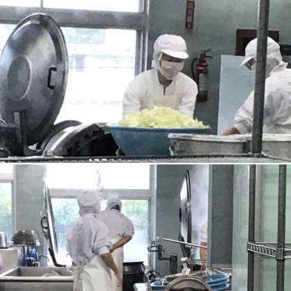 今日は調理場の写真をのせました。山盛りキャベツはスープの材料です。大きな鍋のふたが見えますが、調理場には3つの大鍋があります。今日は、2つを使ってスープを残り1つを使ってチキンライスの具を調理したそうです。調理員さんたちは、チームワークで作業をすすめ、おいしい給食を用意してくださっています。毎日ありがとうございます。