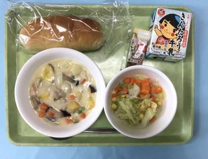具だくさんのシチューの中には、さつまいも、栗、しめじ、他にもたくさんの野菜が入っています。器の中に秋がいっぱい詰まっています。鶏肉もやわらかく煮込んであっておいしいです。実りの秋らしいメニューです。