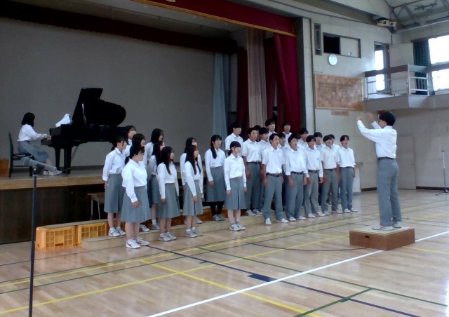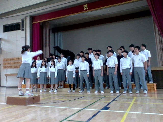 1週間後にひかえた飛翔祭の合唱リハーサルを体育館で実施しました。最初にひな壇にあがったのは5組「あなたへ 旅立ちに寄せるメッセージ」、続いて3組「エール」。歌声の響きにくい体育館ですが、さすがは3年生体育館いっぱいに歌声が響き渡ります。