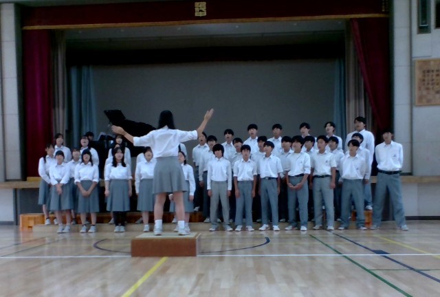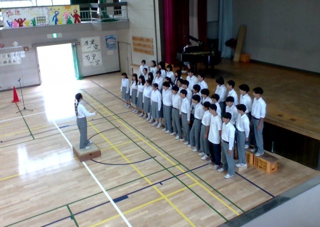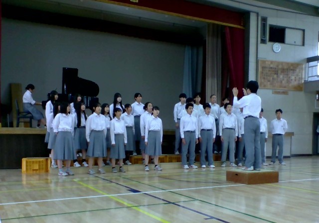 4組の合唱曲は「群青」、続いて2組「手紙〜拝啓15の君へ」、最後は1組の「言葉にすれば」、どの曲も難しい曲ですが、どのクラスもこれまでの練習の成果を十分に発揮していました。飛翔祭の合唱はコンクールではありません、順位も賞もありません。それでも、自分たちのクラスのプライドにかけて、どのクラスも一生懸命に取り組んできました。最後に音楽科担当から「声も出てきたし、3年生らしい合唱になっている、あとは歌詞の意味をもっと考えて伝わるように表現できたら、もっといい合唱になる」とアドバイスが有りました。10月9日、三の丸ホールで今日以上の合唱が聴けることを楽しみにしたいと思います。
