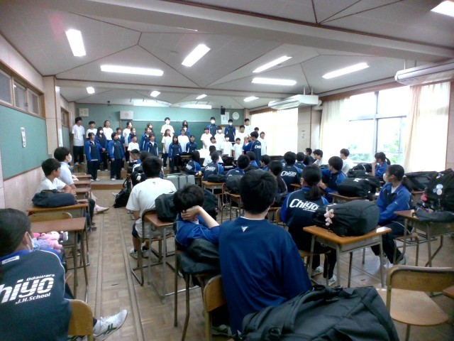 運動会で同じブロックで交流のあった2クラスが、2日後に控えた飛翔祭に向けて合同練習を行いました。1年生は先輩たちの前で緊張しながらも、今まで必死に練習してきた合唱曲「ふるさと」を歌い切り、大きな拍手を送ってもらっていました。