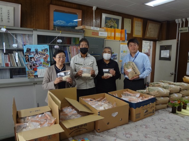 上府中地区まちづくり委員会 農業プロジェクトの方々が、千代中カントリーファームで収穫されたお米を届けに来てくださいました。