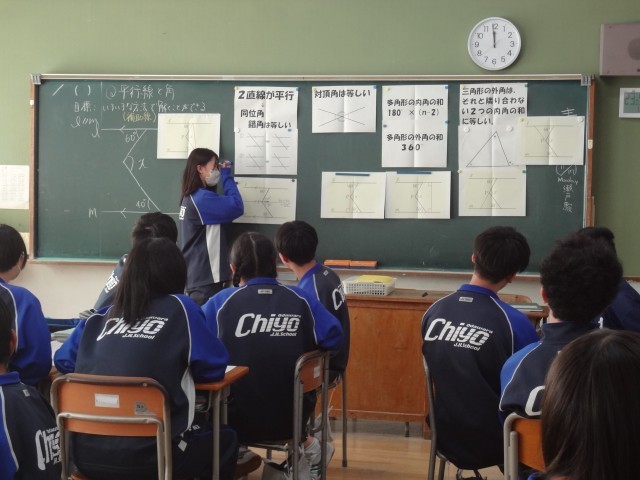 いろいろな角と多角形についての学習で、図形の性質を利用し、補助線を引いて様々な方法で角の大きさを求めています。