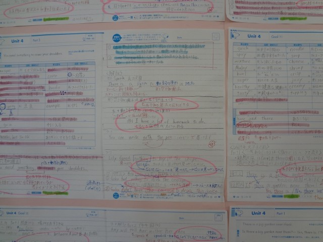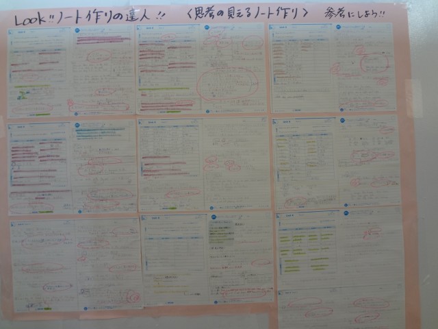英語科のノートづくりについて、お手本となるノートのコピーが掲示されています。