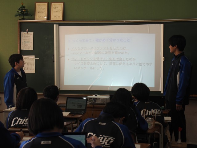 1年生のSTEAM教育では、千代中学校区内の「農家さんの困りごと」から「ジャンボタニシ殲滅作戦!」として、班ごとに試行錯誤しながら探究活動を行い、プロトタイプ(試作品)を制作し、農家さんや農協さんのアドバイスを受けて修正し、スライドを作ってクラス内発表をしました。