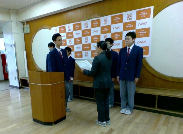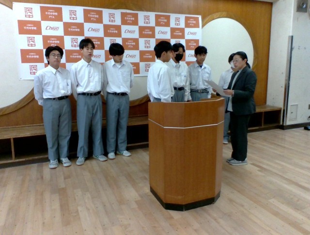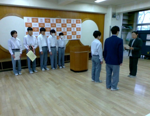 明日からの冬季休業を前に、今年度4回目になる表彰集会を行いました。インフルエンザが心配されるため、今回はリモートでの実施になりました。写真上は男子バドミントン部、中は男子ソフトテニス部、下は剣道部です。