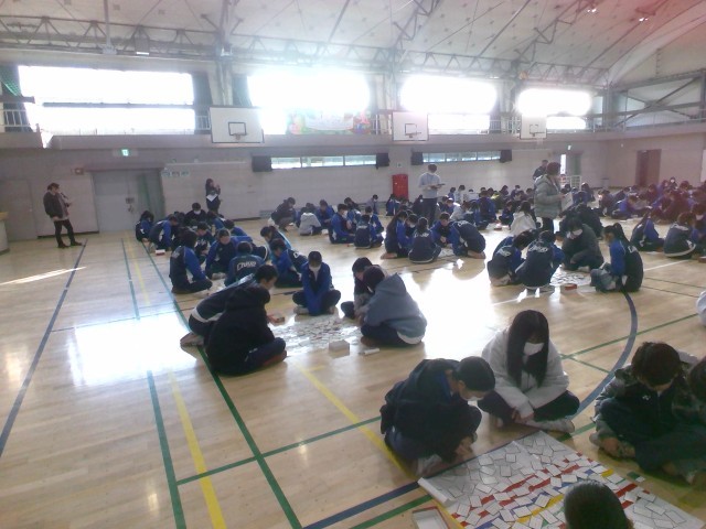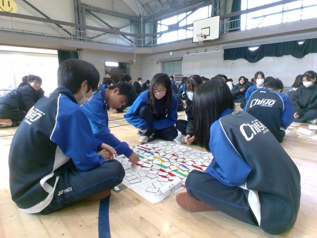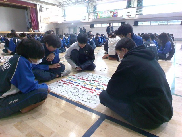 かるた大会では、百人一首の読み札を学年の先生たちが順番に読み上げ、4〜5名のグループごとに競技しました。生徒たちはとても真剣な表情で札を探し、一句一句の行方に一喜一憂して楽しんでいました。今後は図書委員による集計作業の後、クラス全体で一番札を集められたクラスや、個人を表彰する予定です。