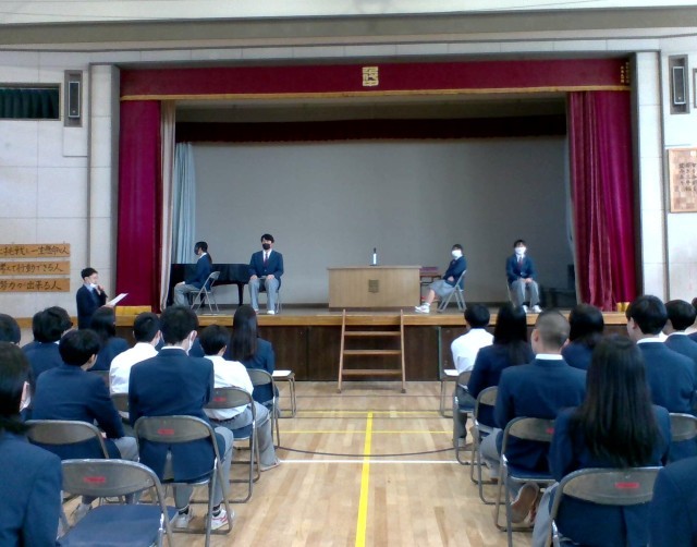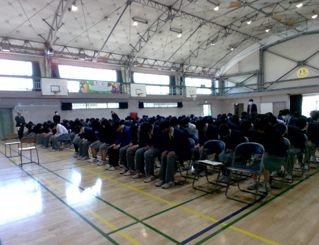 入試関係の予定が一段落し、今日から3年生は卒業に向けた特別日課に入りました。1校時はお別れの言葉の分担などクラスでの話し合い、2校時に体育館に全員集まってオリエンテーションです。今後の日程に加えて卒業に向けた心構え等が先生たちから伝えられたあとは、学年委員の生徒が良い例と悪い例を示しながら、椅子の座り方、立ち方、礼の仕方などを練習しました。この後3校時は、式練習の1回めになります。