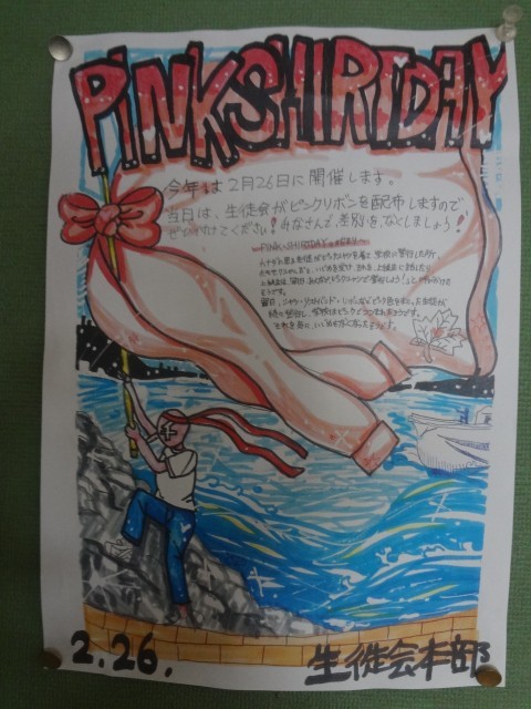 廊下には、生徒会より啓発ポスター、そして子どもたちのいじめ反対のメッセージが、クラスごとにまとめられ掲示されています。