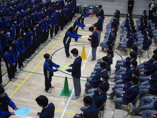 3年生への感謝の気持ちを盛り込んだ代表生徒の言葉と全員で「15の手紙」を合唱して、それぞれが書いたお別れの言葉を代表生徒が渡して、3年生に感謝とお別れの気持ちを伝えました。