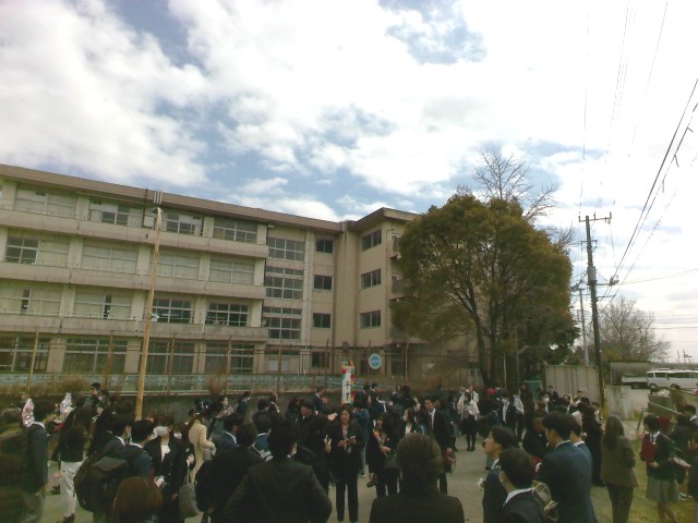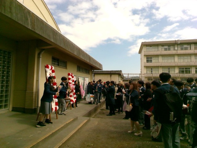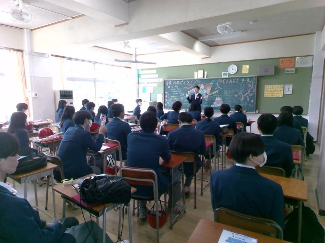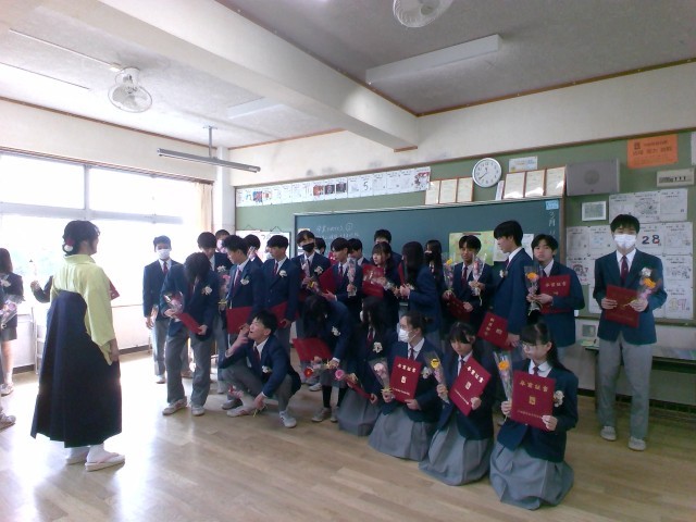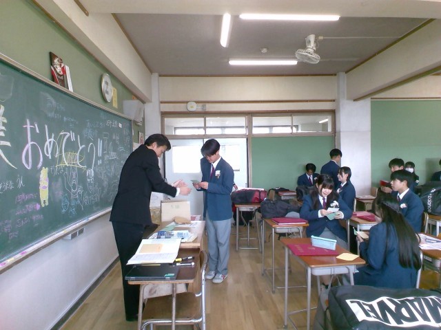 卒業式後は、各クラスに戻ってクラスの仲間や担任の先生と過ごす最後の学活を行いました。最後の学活では、一人ひとりみんなへの一言を話したり、写真を撮ったり、担任から一人ひとりに手紙を渡したり、、、各クラスごと思い思いの時間を過ごしました。学活が終わって外に出てきた生徒たちは、保護者や先生たち、友達と記念撮影をして最後のひとときを楽しんでいました。