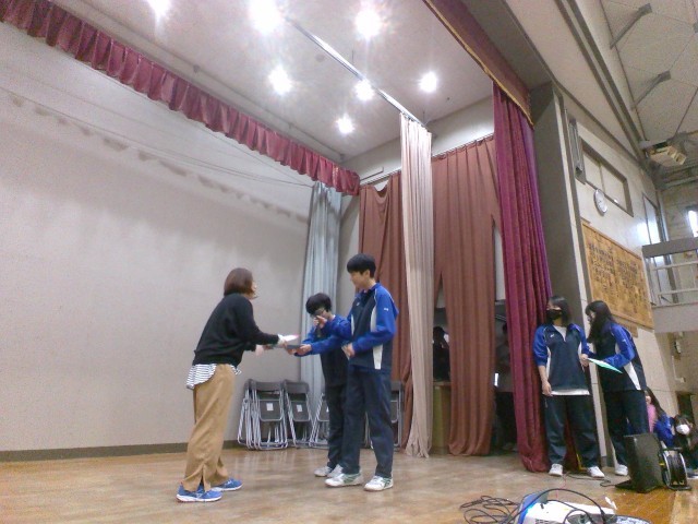 2学年行事日の今日、1時間目は学年委員が企画した「仲間を知ろう」を行いました。「仲間を知ろう」では、趣味や特技、体育の授業で取り組んだ創作ダンスをステージで披露しました。クラスメイトの普段と違う一面や他のクラスの仲間たちの姿に、自然と笑顔と拍手があふれました。最後に先生たちがサプライズ登場。こっそり練習を重ねてきたダンスを生徒たちに披露しました。また、英語の授業でお世話になった遠藤先生にクラスごとに作ったお礼のメッセージカードを渡しました。