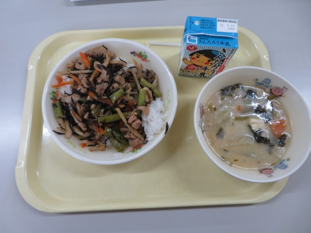 今日の給食は、神奈川県産のひじきを合わせたごはんと豚汁です。ひじきは神奈川では、三浦半島や湘南のものが有名のようです。