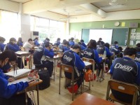 表彰の様子はリモートで各教室に配信されています。写真上のように表彰の前に代表生徒から戦績の紹介や抱負などが話され、その後校長先生から賞状を手渡されます。
