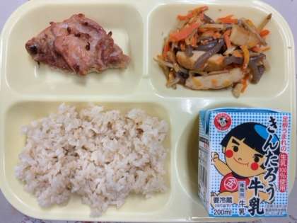 今日のメニューは、鶏肉のガーリック焼き、こんにゃくのきんぴら、さくら飯、牛乳です。