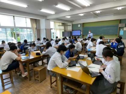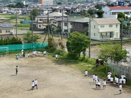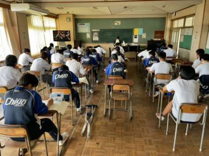写真は上から、2年生の保健体育科「走り幅跳び」、3年生の音楽科「鑑賞」、技術科「ミニトマトの栽培」です。