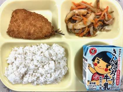 今日のメニューは、いわしフライ、五目きんぴら、麦入りご飯、牛乳です。