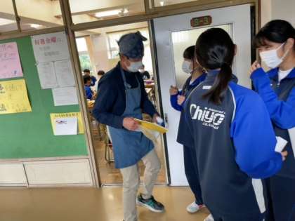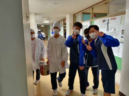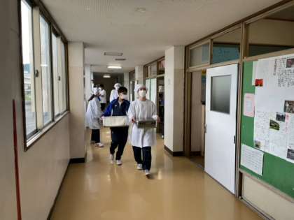 給食当番は、ちゃんと仕事をしています。給食当番の通行の邪魔になっている人がいましたが、それは写真を撮る私のせいです。