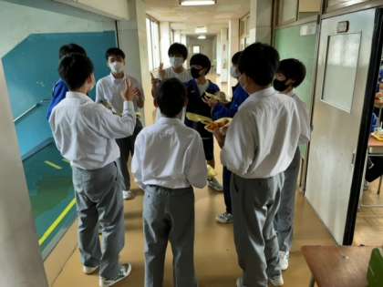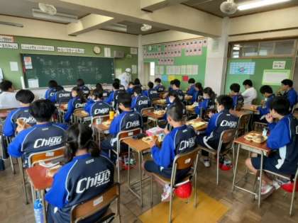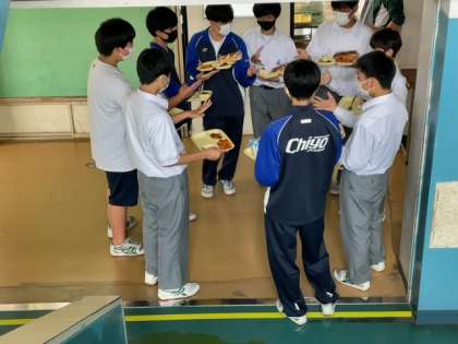 今日の“全校いただきますトップ”は、3年1組でした。その頃、1、2年生はまだ準備が完了していませんでした。3年1組が默食し始めて少し経った頃、3階では2年3組の男子たちが、“黒パン争奪のじゃんけん大会”を廊下で行っていました。かなり熾烈な戦いでした。
