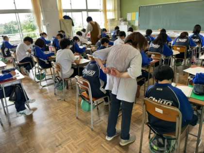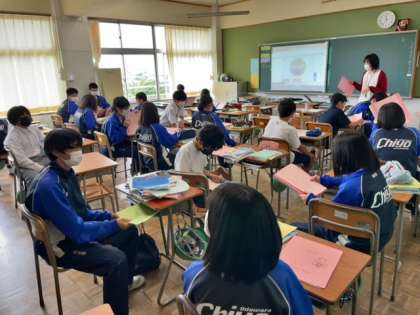 写真(上)は、英語科でペアワークをしているところです。写真(下)は、家庭科です。集中してワークブックに取り組んでいました。
