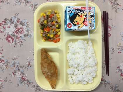 今日のメニューは牛乳、ご飯、ベジタブルソテー、白身魚のイタリアンソースがけ、です。イタリアンソースとはどんな味なのだろうと興味深く味わうと、やや酸っぱい感じが口の中に広がり、白身魚の柔らかい食感に良く合う気がしました。隣の吉田先生は食べながら地中海を感じたそうです。