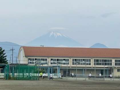 6月17日(金)、朝練習をする男子ソフトテニス部員の遠く向こうに見える富士山に、よく見ると傘雲がかかっていました。もう少し空が青ければ、もっときれいに見えるのですが、この景色もいいものです。