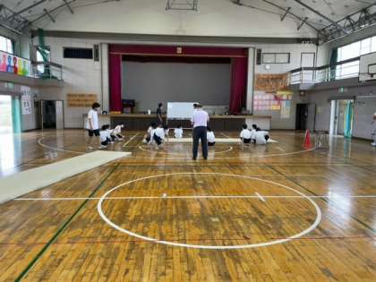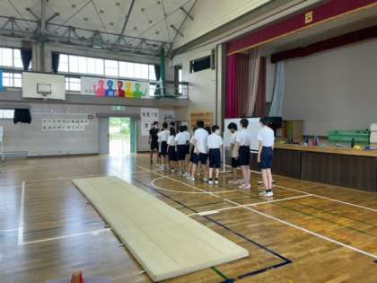 授業内容は“マット運動”です。写真は授業開始直後で、これからウオームアップのランニングが始まるところです。