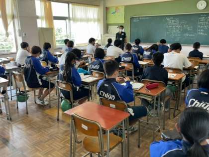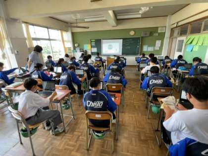 6月20日(月)3校時の2年生です。写真は上から、英語科“クロームブックで課題に取組、終了14秒前”、数学科“連立方程式”の学習の様子です。