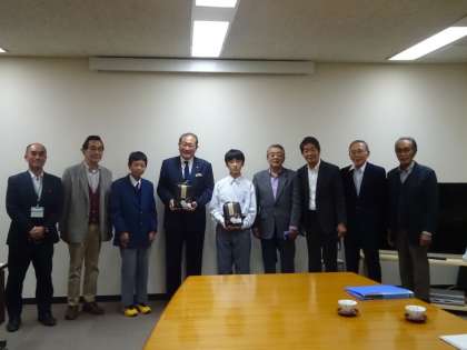 27日(木)の夕方、小田原市役所において、上府中まちづくり委員会の皆様とともに、千代中カントリーファームでの体験報告を行いました。田植え、稲刈りの両方に参加した1年生2名が、収穫米を小田原市長へ手渡しました。