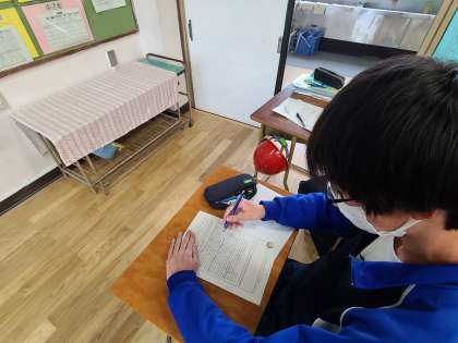 3年生では受験(受検)に向けて、面接シートを作成しています。志望校の理由や教科での努力点、教科以外の努力点、自分自身のよいところなどを記入しました。志望校の情報は学校説明会も行っていますが、「Chromebook」を使って、情報収集しています。