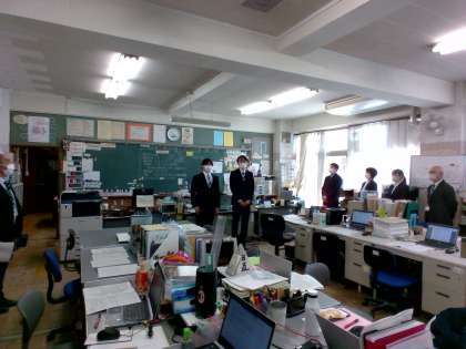 職員会議に先立って、今年度新たに着任された12名の先生方の紹介がありました。また、会議の途中で新採用の先生お二人が到着し、挨拶をいただきました。他にも新たに配属となったスタッフのみなさんも含めて、令和5年度の千代中学校がスタートしました。