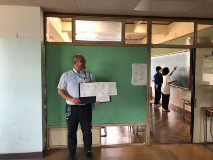 避難までの訓練後、教室での引き取り訓練を行いました。昨年は、グラウンドでの引き取りを訓練しましたので、本年度は教室に残った状況での引き取りを想定して行いました。