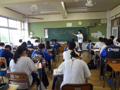 「動名詞〜ing」と「to不定詞」の違いについて先生の話を真剣に聞いています。