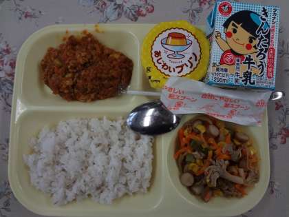 牛乳、ドライカレー(麦入りご飯)、きのこソテー、なめらかプリン