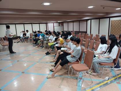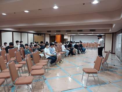 夕食後にクラスごとに時間をくぎってクラス会議を行いました。班ごとに1日の反省をまとめて発表したり、実行委員会から連絡や確認事項が話されました。写真は、4組と5組のクラス会議のようすです。