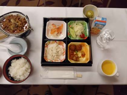 今日の夕食のメニューは、白ご飯、コーンスープ、野菜サラダ、ビーフストロガノフ、サーモンのマリネ、ツナと玉ねぎの和え物、ミートボール、ロールケーキとオレンジジュース、です。