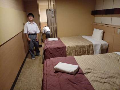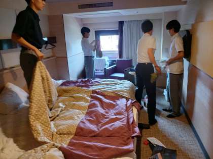 2日間を過ごしたホテルを出発。その前に部屋の片付けが大変でした。お菓子やペットボトルのゴミ、脱ぎ散らかした服…、時間ギリギリまで掃除が続きます。