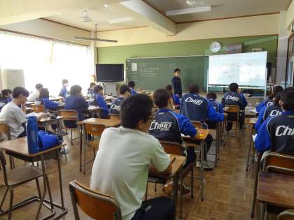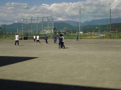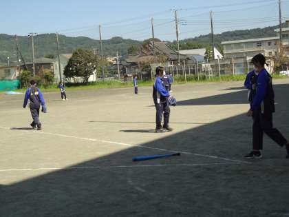 さわやかな晴天の中、グラウンドでソフトボールの学習をしています。