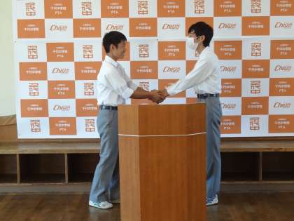 旧生徒会長と新生徒会長の間で、固い握手が交わされました。