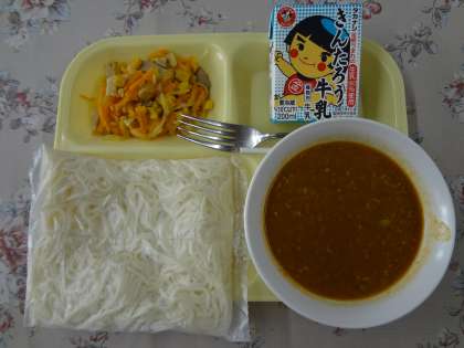 牛乳、ソフト麺カレーソース、ハムとコーンのソテー