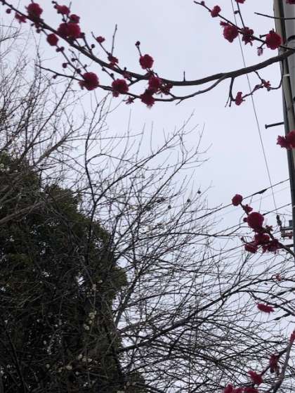 校地内の梅の木に紅と白の花が咲き始めているのが見えます。