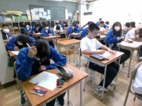 6校時に2年生は本年度2回目の学年集会を行いました。前半は、学年委員の自己紹介、学年目標の発表と、学年委員会の生徒たちが中心になって集会を進めます。ちなみに、自己紹介のなかで学年委員の好きなお菓子は、たけのこの里よりもきのこの山のほうが多かったようです。