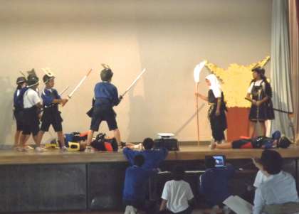 文化活動発表会前日の30日、4校時に体育館をのぞくと2年生が集合していました。ステージでは、総合学習でとり組んだ鎌倉についての劇のリハーサル中です。衣装にもこだわって、鎧甲もていねいに作っていたので、ぜひ成功して欲しいものです。体育館の後方では会場装飾の生徒たちが薄明かりの中、飾り付けをしていました。ちぎり絵の千代中ヒーローも準備されています。どんなふうに飾り付けられるか、楽しみです。