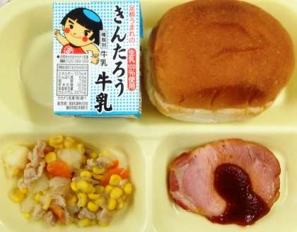 今日の給食のメニューは、グリルハムバーガー、野菜ソテー、牛乳です。