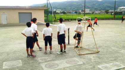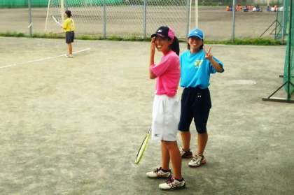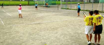 写真は、テニス部の練習風景です。男女ともに、よく声を出して練習しています。