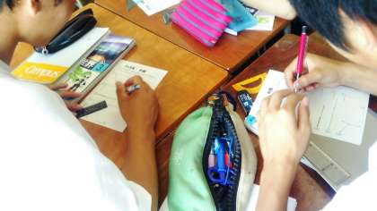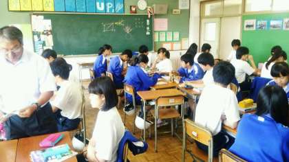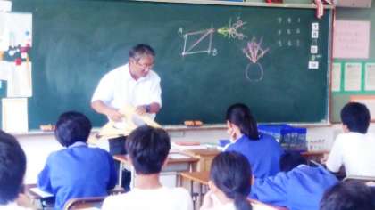 写真は、3年5組での校内研究公開授業の様子です。授業者は、理科の伊豆浦貴先生です。