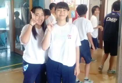お客様を玄関のところでお見送りをしていると3年1組の生徒たちが降りてきました。お客様と一緒に来た4才の男の子を見て「かわいい〜」と言いながら「私たちもかわいいでしょ」とピースサインの2人です。この明るさがとてもいいです。