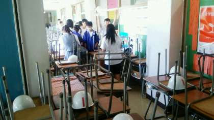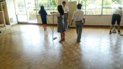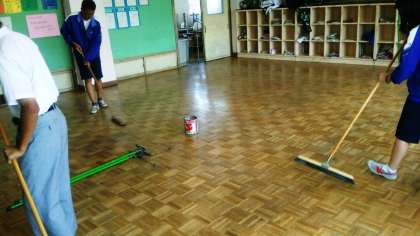 大掃除のあと、帰りの会が終了し、教室内の机椅子をすべて廊下にだし、ワックス塗布をしているところです。