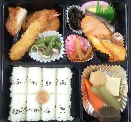 写真は、給食ではなく、先生方全員で注文した「仕出し弁当」です。エビフライ、一口カツ、鶏の照り焼き、インゲンとハム炒め、鮭の塩焼き、煮物、烏賊のチリソース、蒲鉾、卵焼き、漬け物、梅干し…とたくさんのおかずの弁当でした。