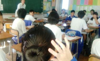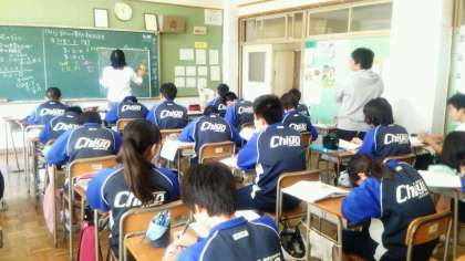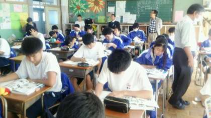 写真(中)は3年2組の国語、写真(下)は2年4組の数学の授業風景です。国語ではじっくりとノートに書く様子を、数学では1次関数の直線のグラフを書くところを見ていただきました。